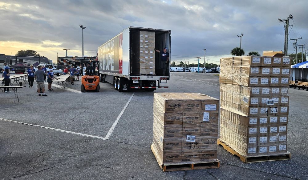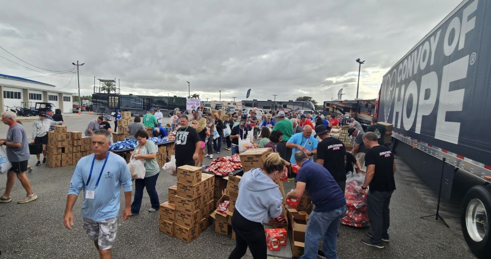 Wednesday we were at work by 7:00am setting up our service project. This was in conjunction with Convoy for Hope who furnished us an 18 wheeler full of food. We assisted in getting the many pallets of food into the correct locations for our production lines. Once we got everything going, it took us about two hours to fill 3,700 bags of food and load them back into trucks for distribution by the local churches. So proud of all the hard work by all the United Rally attendees.