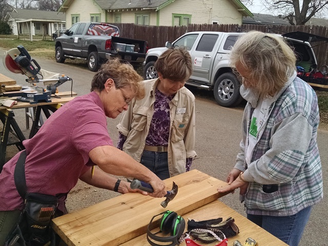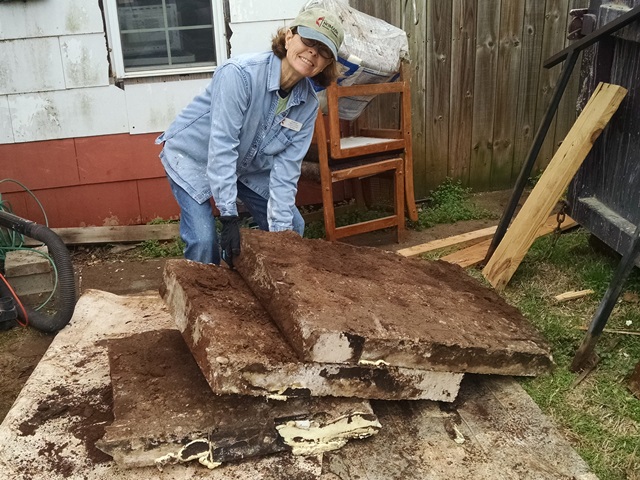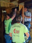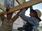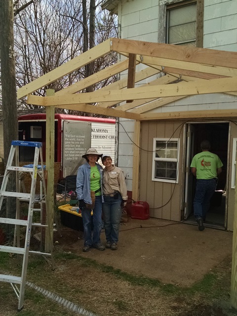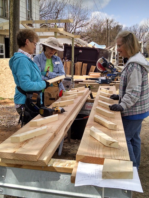 Gwen led our devotional time this morning which we moved to 7:30 to try to be working by 8:30. Gwen did a great job leading us and we did make it to the job site by 8:30. It seemed everyone felt good about what we accomplished today. We divided up into 3 teams. We were on the porch team along with Gwen and we had a good day. We put up all the hangers for the rafters, the rafters, the roof decking and the felt today. That was more than we thought we would do. All that’s left on the porch is the shingles. Gary and Henry were the plumbing team. However, they were limited in what they could do because the VIM coordinators decided against renting the concrete saw we needed and instead elected to have the professionals come cut/remove the portions of the slab that had to be removed for the drains. So when Gary and Harry completed what they could do on the plumbing they became the demolition team on the stairs while we waited on the concrete guys. The stair team was Pat, Barb and Scott. Before they could start they had to move a lot of stuff that was in the way of the new stairs. The old steps were then removed and the stringers built for the first flight of steps and the first landing framed in. They made a lot of progress. There was also a window installed in the kitchen and additional framing on the back wall of the house. The concrete guys came late this afternoon shortly before we were going to stop work and they ran us out of the house. They are NOISY and MESSY!! Some days you work really hard and don’t see a lot of progress. Today we could see the progress. That felt good.