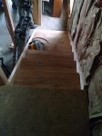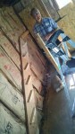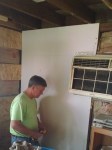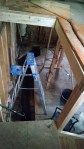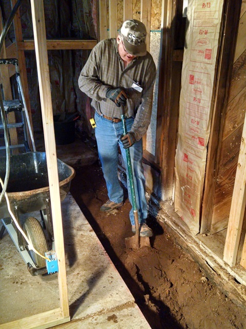 Today was not as sunny as yesterday, but was still warm. Several of the team members spent most of the day outside preparing lumber for the new stairs and installing siding. The Volunteers in Mission (VIM) coordinators working with us today put the roof on the new porch and started hanging the drywall. Since the concrete was sawn by a contractor yesterday, Henry was able to prepare the trench for the new plumbing. Hopefully, the plumbing supplies will be delivered tomorrow. More milestones were reached on the new stairs. The first run of steps and the landing were completed and the opening for the second run was cut upstairs.