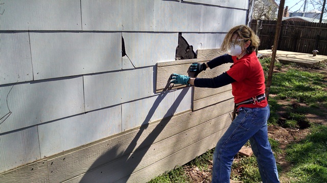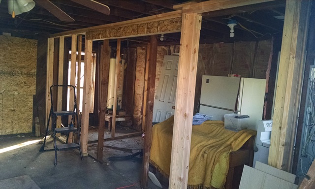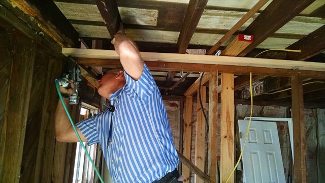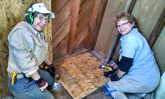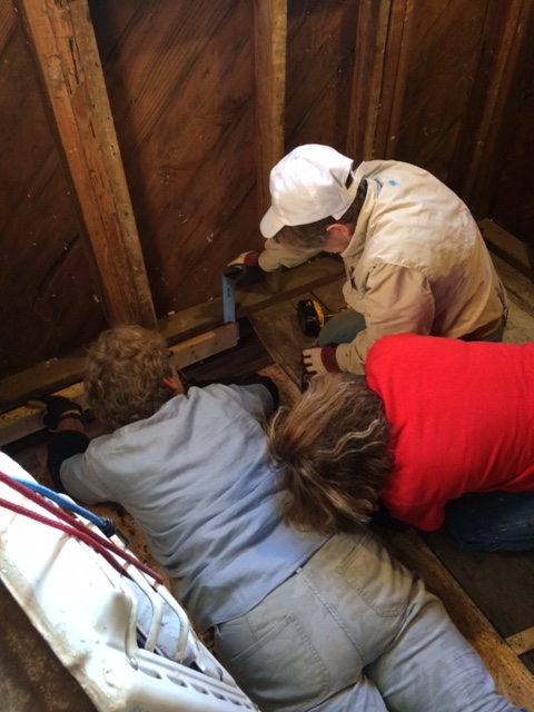 We started work on Plan D for our homeowner. It’s sort of a combination of Plan A and C. He doesn’t want us to move his bathroom down stairs for some very valid reasons. His case manager and we had hoped to limit his trips up and down the stairs but we will settle for making the steps safer and easier for him to navigate. He is very excited about the planned improvements and the work we have already done. We told you last night that Gary left the homeowner with the plan and a red pen to mark changes. He did mark up changes and left us a note on the floor plan “Very exciting, Awesome!” Those comments really energized us to get busy. So, today we patched some holes on the exterior to help protect the interior repairs from moisture and vermin. The demo divas sort of split up today to divide and conquer. We didn’t have as many laughs without our girl power trio though. The upstairs bathroom floor was patched and is almost ready for the final sub-floor installation. That should be completed first thing in the morning. The insulation installation was completed. Also, the new wall for the kitchen was installed and the old wall will be demoed in the morning. Doesn’t necessarily sound like a lot, but it was a day of hard work.