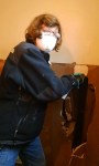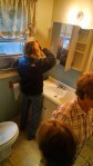 The ladies really rocked today. They had fun demolishing a bathroom. Everything had been leaking and the floor is rotten. The ladies first removed the shower, commode, and sink/vanity and then removed the old drywall from the walls and ceiling.