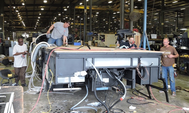 Max felt better today than any time since his surgery so after carefully checking the weather this morning we decided we could get a road trip in before the thunderstorms hit. At about 6:45 we headed out to Red Bay Alabama. What? You say you have never heard of Red Bay? Red Bay is not near the ocean, not on a bay, and is a tiny little town on the far western border of North Alabama. The population is about 3100. According to our guide today, who was a retired history teacher, Red Bay was named for its red soil and the bay trees that grow there. Red Bay is home to Tiffin Motorhomes which was our destination for today. Tiffin also happens to be the manufacturer of our FRED. We think Tiffin is the only RV manufacturer in the state of Alabama and we are very glad they are here. Their Phaeton model has been the best selling model of class A diesel pusher motor homes for a number of years. They currently produce 12 motorhomes each work day and employ about 1,500 people. We took the factory tour today and then spent a good deal of time looking at various rigs. Sometimes when you want to see various models, fabrics or décors it’s easier to go to Red Bay because dealers usually only have a few units in stock at any point in time. We always like to take factory tours to watch companies make anything from ice cream or candy to cars and RVs. This was not our first time to tour the Tiffin plant but we enjoyed it again. If you are ever in the area, they conduct tours each day they are open at 9:30am. After you do the tour and if you are still looking for something to do you can check out the Coon Dog Cemetery or the Rattlesnake Saloon which are also in the area. We have visited both of those compelling locations before so refrained ourselves today. We wanted to get back home before the storms arrived and fortunately we did – just barely. Hope you have all had a great start to your week.
