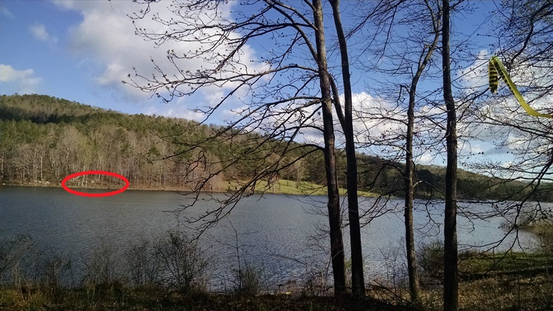 Zip line at the Lake Trail. This section will end where the red oval is across the lake.