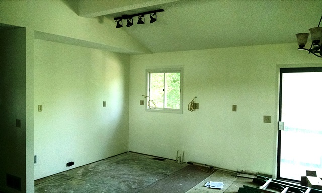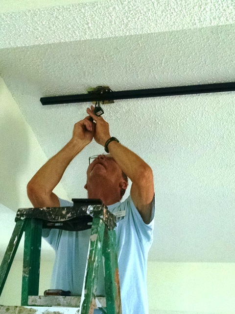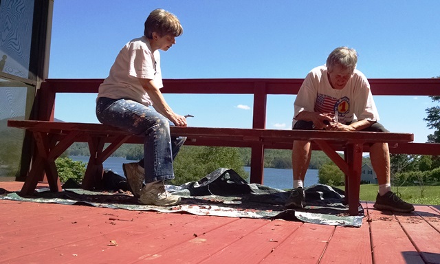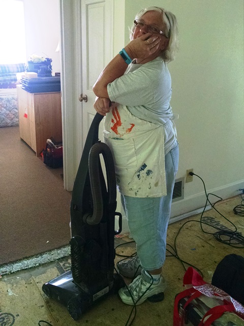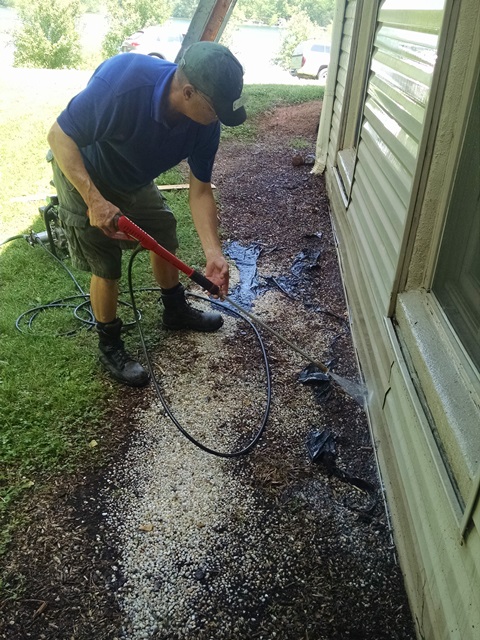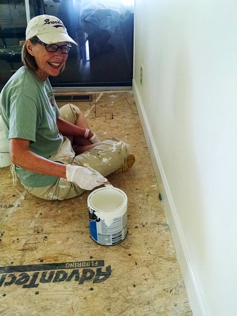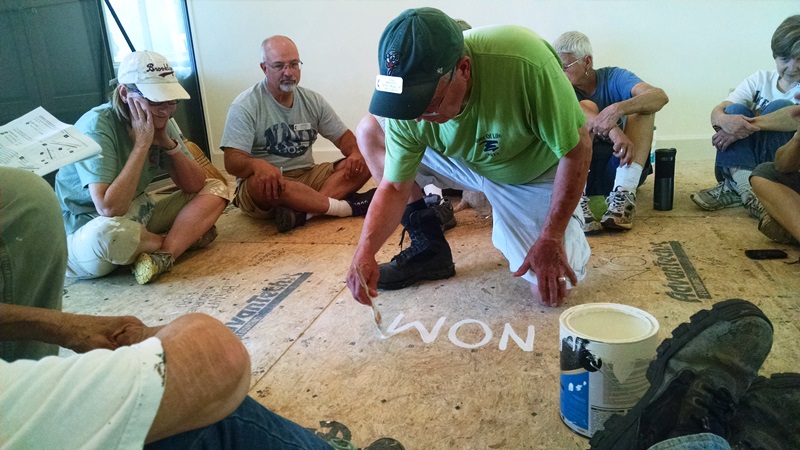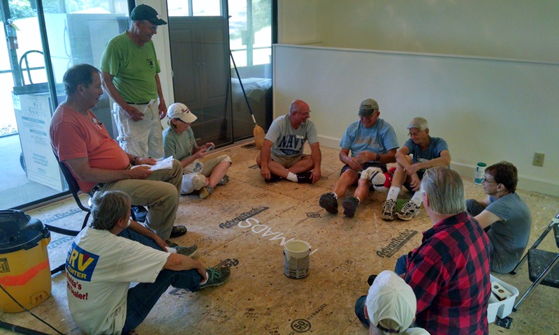 What did we do today? We finished the Lake House remodel!!!! A day early!! AWESOME!! We had hoped that the subcontractor who is building the custom cabinets would finally arrive, but it was not to be. Nothing else can be done until the cabinets and flooring are installed. This morning we installed the last of the trim, installed the wiring for the heat pump, touched up a few areas on the paint, and then started cleaning up. The clean up took a while. Getting all our tools back to the motor homes, and the Hinton tool shed was a big task. Then cleaning up all the dust was another big job. The pressure washing of the exterior was also completed. We then had a little time with Bill where we all signed our names on the floor which will be covered with carpet. Bill thanked the team for all their hard work and officially declared our part of the remodel complete. We know the pictures don’t look complete but we will post some additional pictures after the cabinets and flooring are installed. They will also have to get someone else to do the final plumbing and electrical since that can not be done until after the subs complete their work. We had really hoped to do that job for Hinton. Tomorrow we will be doing some outside work.
