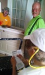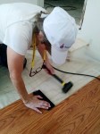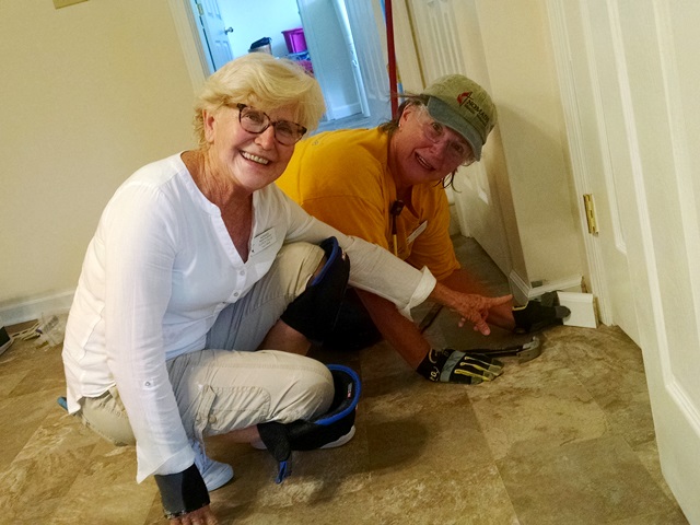 Rita and Karen helped with that project for a while and then took on the quarter round trim work in the bathroom. The ladies rocked it!! Suzanne, Anne and Max were again working on the flooring in the sitting room. At lunch we came back to the RV to cool down and eat. As we were getting ready to return to work the power went off. According to the office, the power had been going off intermittently for about an hour but then went totally off. We all made sure our generators were on keeping our rigs cool and then returned to work. It was more of the same this afternoon. The flooring became more difficult because we had to install the laminate into a bay window. The flooring in the sitting room is almost complete. Maybe 5-6 more pieces to install in the morning. The bathroom is almost complete. We need to install some base in the closet and caulk the quarter-round and we can mark the bath done. The bedroom has a little more of the quarter round and some paint touch up and it will be complete. HOPEFULLY we will complete some rooms tomorrow.