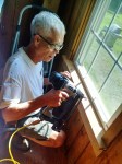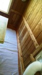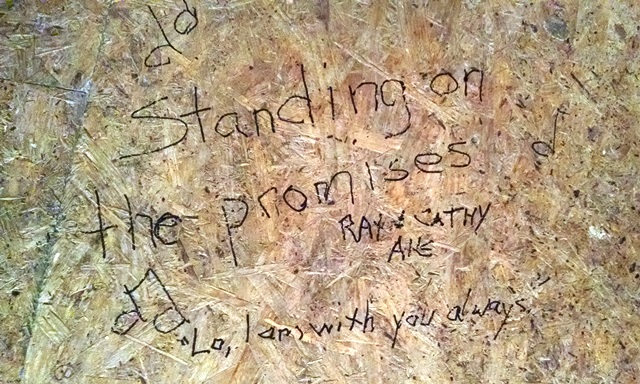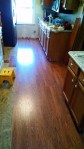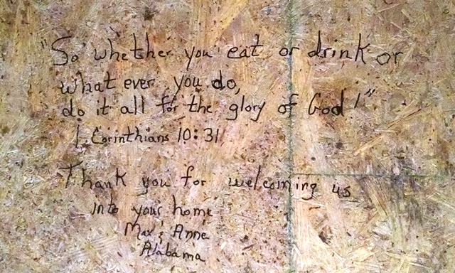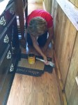 We split the team again today between Mary Elizabeth’s and our new job for Leon and Virginia’s. Max, Carol Suzanne and Larry to Mary Elizabeth’s and Anne, Ray and Cathy to Leon and Virginia’s. But first, Anne, Ray and Cathy went to Dora’s to install the cabinet. What should have been a quick easy install took longer than expected and we had to make a Lowe’s run for fasteners. We also needed to make a small piece of chair rail to cover about a 2 inch spot. Anyway after completing that task we got started at Leon and Virginia’s again working on the drywall sanding and mudding. We ladies just love all the drywall dust in our hair. NOT!! At Mary Elizabeth’s, Max, Carol and Suzanne made great progress on the laminate and Larry worked on the cedar trim installation in the dining room. After lunch Anne and Carol switched jobs. We wrote our thoughts and thanks on the floor in front of the kitchen sink today shortly before covering it with the laminate. The folks working at Leon and Virginia’s came back to Mary Elizabeth’s to help us move heavy furniture shortly before finishing our day. With the laminate complete in the dining room we moved the furniture back into place. Mary Elizabeth was so excited to have her china cabinet back in place. She immediately started washing her china and putting it back into the cabinet. The kitchen is about half finished. Some of the rooms we are mudding and sanding are now ready for the ceiling stippling. Great team with lots of work being accomplished. One more day left for us, but the work will continue long after we are gone.