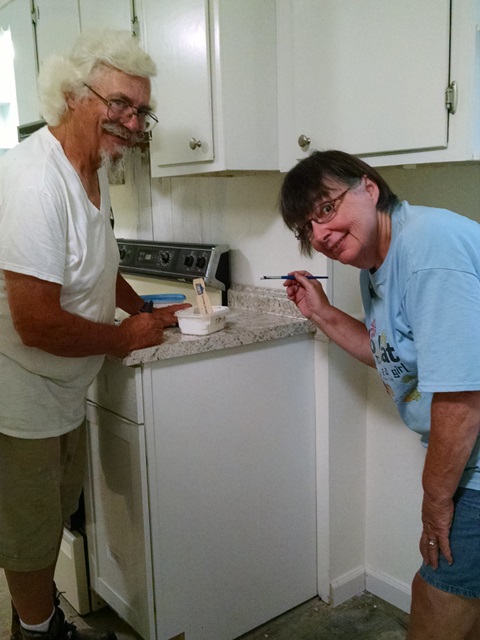 Roy and Cathy had devotion today and it was really fitting for a Disaster Rebuild project. After devotion we asked everyone to be flexible today since Jeff called early this morning with some changes in priorities. He needed us to go set a small cabinet in the kitchen of Dora’s house. Jeff also had delivered the lumber for the chair rail and base for Mary Elizabeth’s so we needed to get that installed as well.