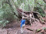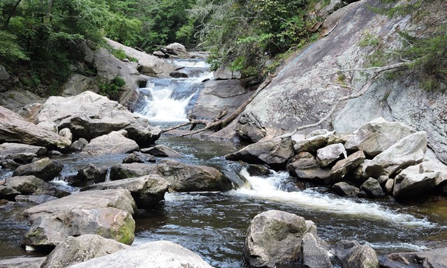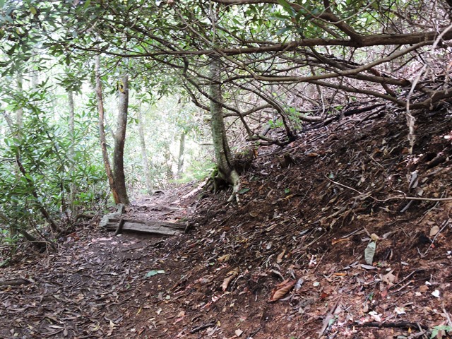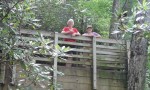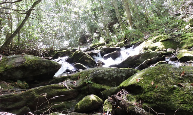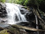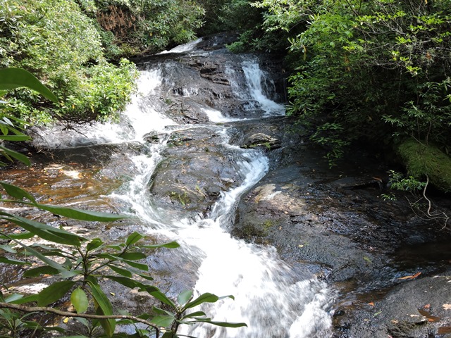 We left the campground going in the opposite direction on Standing Indian Campground Road following the headwaters of the Nantahala River. The road changed to dirt and gravel. Shortly we stopped at Laurel Falls. Lots of things around here are named Laurel something because of all the mountain laurel in the woods. Along with the mountain laurel there was also lots of rhododendron in the woods around Laurel Falls.
