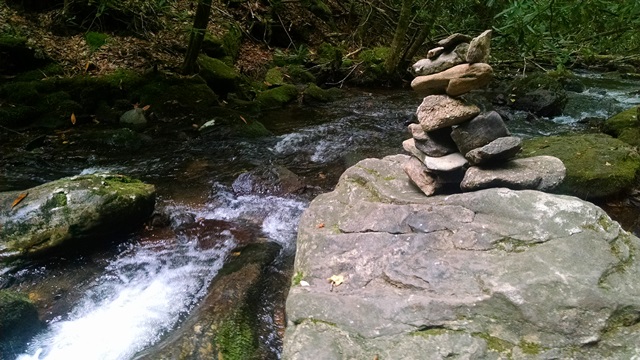 Stacking rocks into kairns seems to be popular around here. This one is just below Laurel Falls.