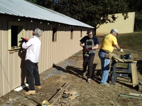 Previous Image Next Image Joyce, Evelyn and Tom putting trim on the barn windows Joyce, Evelyn and Tom putting trim on the barn windows