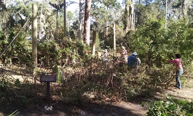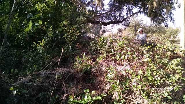 The maintenance guys were also off so they didn’t really want us in the other buildings or on the equipment like tractors. So today was a different day for most of us since we all worked outside. The ladies worked on cleaning out what used to be an azalea garden. Jo saw one bloom in this big heap of moss and limbs, and foliage the other day. From what she could see and a sign that was almost completely covered by overgrowth she thought is was an abandoned rose garden. The ladies worked really hard but saw great results for their efforts. Max and Mark were able to continue their work in the water treatment area. Anne helped there this afternoon. Mike and Chris worked on the fence again. Bob and Lee did some landscaping cleanup, with leaf blowers.