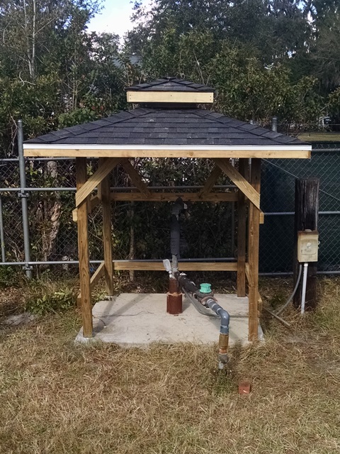 They completed the copula on the pump house and installed part of the siding. Mike and Ruth worked some in the chapel and then Mike and Terry installed some privacy screen on the fence at the water plant. Carol and Ruth did a lot more landscaping work. Lee continued working on changing out light bulbs all over campus.
