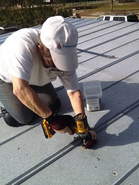 Previous Image Next Image Anne replacing nails with screws on metal roof of generator building Anne on a hot tin roof replacing nails with screws on the generator building