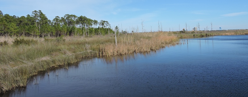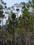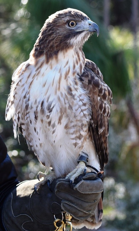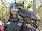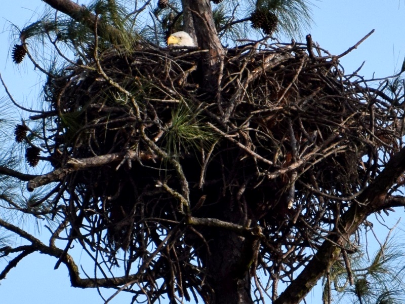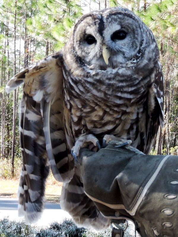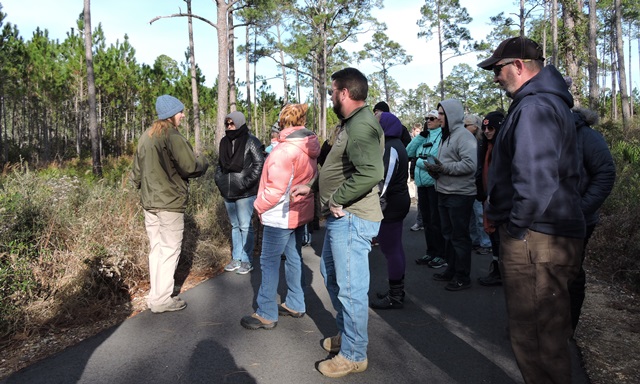 The Alabama state parks have a program named “First Day Hike”. The first day of the new year, a ranger from each participating park leads a hike of their park. It is usually a pretty easy hike that highlights a feature of the park. We try to go to different parks to do the hike each year. The hike here at Gulf State Park this year was on Eagle Loop Trail that passes within viewing distance of an eagle nest. There is a pair of eagles on the nest so we of course wanted to make the hike. We wondered if it would be canceled due to the weather because others across the state were canceled, but not here. We put on multiple layers of clothing and went to the trail head. There was actually about 30 hardy souls at the trail head at 2:00. The park staff had a red tail hawk, a great horned owl and a barred owl for us to see and photograph while we waited for everyone to arrive. Really beautiful birds. The hawk is new to the park – less than 2 weeks at the nature center – and appears very curious when in reality his eyes aren’t focusing due to damage from West Nile virus. His depth perception is about 2 inches off when they try to feed him. He sadly will not be able to be released back into the wild. The staff had also built us a fire which we hated to leave when it was time to hike. But hike we did. Kelly, the park naturalist, lead the hike and shared information on various plants in the park as we walked. By law you can not be closer than 333 feet to an eagle nest or bother them in any way. Our first view of the nest we were quite a distance away but later in the hike we were closer and could see the white head of an eagle hunkered down in the nest. Beautiful bird. We also walked out to lake Shelby, the feeding ground of the eagles and learned more about the birds in the area and critters in and around the lake. We were told that the female eagle is on the nest about 80 percent of the time and the male relieves her for about 20 percent of the time. After the eggs are hatched, they share the work of feeding the little ones more equally. It was a good first day hike with a surprisingly large group given a temperature of 36 and wind chill in the teens.