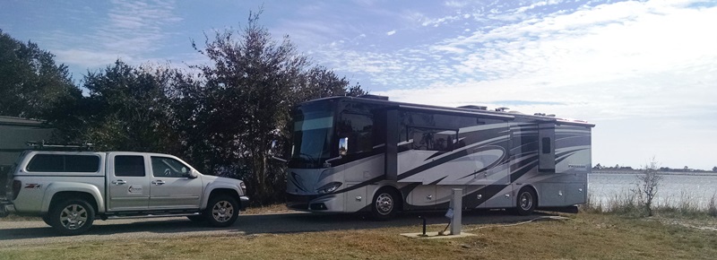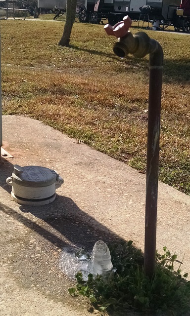 It was cold this morning. Really cold for Gulf Shores. The rangers here at the state park had asked everyone to please disconnect from the water system and leave the water dripping last night. Not a problem. We weren’t planning to leave our hose out in 26 degree weather. It was really surprising to us the number of people who seemed totally surprised to learn the weather was going to get really cold. Evidently some didn’t believe it because there were a number of broken pipes today. We felt sorry for the guys having to be out in the cold repairing them. We had this cool looking stalagmite icicle this morning at our dripping faucet.