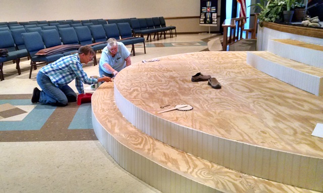 Elaine worked in the Thrift Shop this morning but came outside and helped us in the chapel for a while this afternoon. Janie and Karen have been working on new flooring for part of the stage area, and enlarging the steps to the stage. They have made good progress and plan to start gluing down the flooring tomorrow.