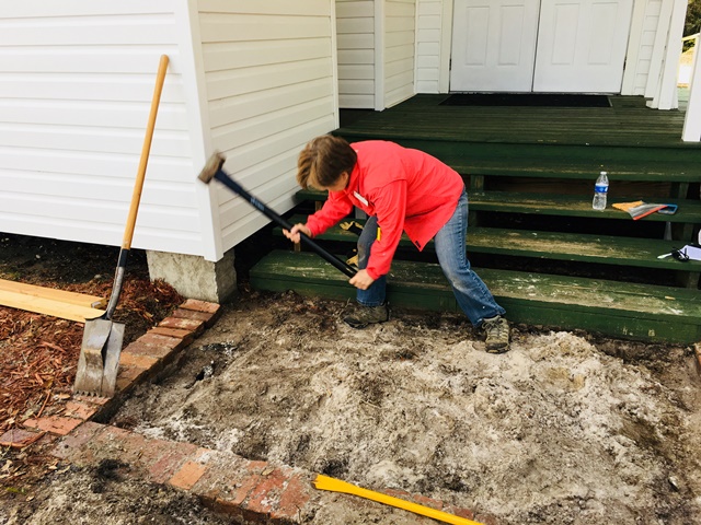 Max, Lou and Rod headed back to the hurricane house which is located about 30 minutes away in Homosassa, FL. Max and Rod finished framing out the walls in the bathroom, reinstalled the light and then began on the plumbing. Lou continued to trace down electrical problems and reinstall more outlets. Good progress was made in the house today. Ruth was back to painting trim for the sanctuary and Karen and Janie began the installation of the vinyl on the stage. The ladies are making the sanctuary look nice. Bob and Mike continued to work on moving some accordion room dividers to another room. This has turned in to quite a project since the divider is very big. Anne, Carol, Elaine and Joanne returned to the wall project for a little recheck and then moved over to the chapel to work on removing brick and forming up for a concrete pad at the base of the steps. What everyone thought was going to be a really quick project turned into a lot more. All the interior brick were bedded down in sand and were easily removed. Then it was discovered the border bricks were actually two bricks high, on a concrete footing, and set in concrete. The ladies had to bring out the sledge hammer and the electric chisel. It was decided to leave the very outside border. That project will be continued tomorrow. It was a productive day. This is a really good team and we have really appreciated their support and concern for us. Hope you are having a good week.