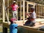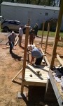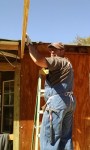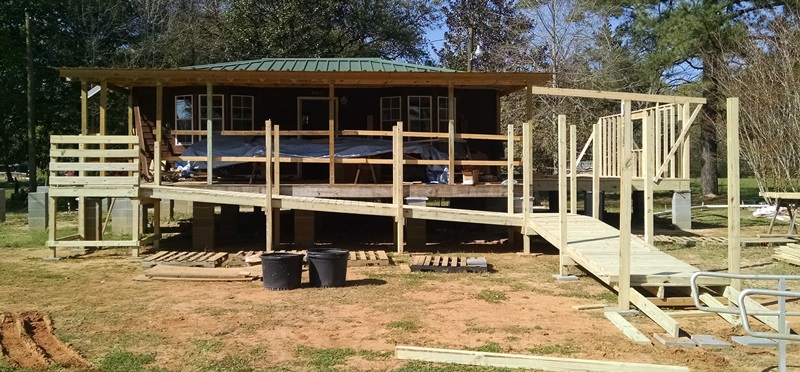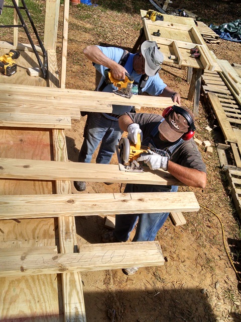 Today our team again worked really hard. The wheelchair ramp is almost complete. The hand rails will go up tomorrow and a few other finishing touches. We think it looks great! The room addition went slower today. We had to make some decisions on how we wanted to proceed. The original plans for the attachment of rafters to the existing structure resulted in less slope on the roof than we felt was required. So there had to be some adjustments made. A good deal of time was then spent brainstorming, head scratching and trying different options. We ended up taking down the wall we raised yesterday to make those adjustments and then raised it again. We now have what we believe is a better plan and should be able to move forward tomorrow on getting the rafters and other two walls in place. Today we also did more demolition inside the existing structure in preparation of removing two windows and cutting in an additional door. There was also more demo of fascia and soffit. This afternoon the handicap accessible shower was delivered. That delivery allowed us to then have exact dimensions in order to lay out the bathroom. Several of the ladies looked at different options and presented them to Richard who then decided how he and his wife want it built. Looking forward to moving ahead on that tomorrow, too.
