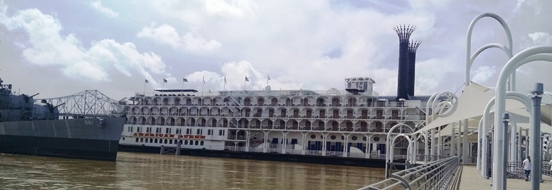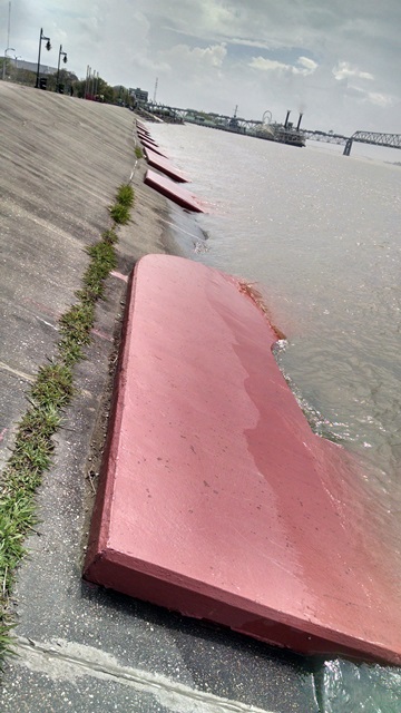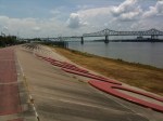 Our new team members, Stel and Jodi arrived shortly before noon. We are so thankful they arrived safely. After helping them get parked, we headed into Baton Rogue to run errands. Since the sun was out we drove down to see the Mississippi River and walk the levee. We took the umbrella for our walk so of course there was no more rain. We were amazed at the height of the river. We saw up close and personal why the Mississippi is sometimes called the big muddy. If not for the levees all of downtown and the LSU campus would be under water right now. The river was running very swiftly and the flooding is now causing problems for the barges. Another 6 feet and the water would top the levee. We had a very interesting walk, taking in the sights. We also discovered that parking is a problem downtown so when we get to ride the levee we will probably drive to the other end of the trail to start.