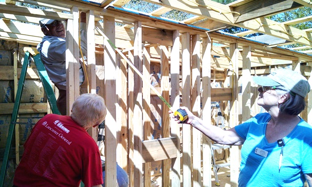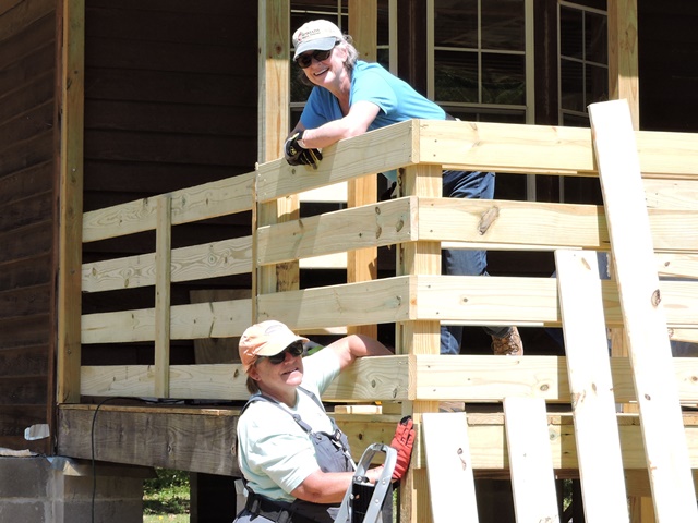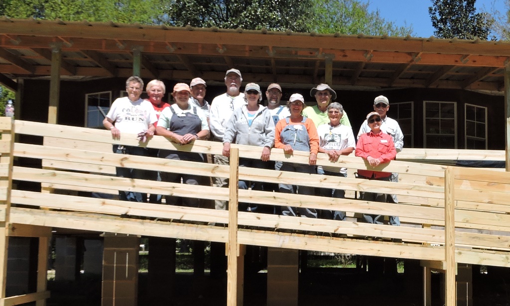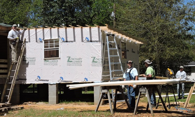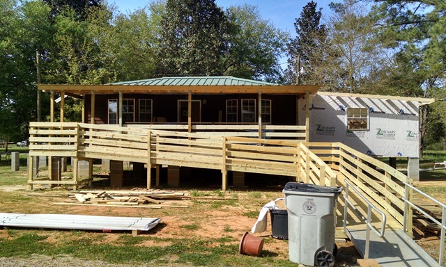 While we were in Denham Springs, the team returned to work. It was a busy day and everyone is tired tonight. Today Rita and Lisa completed the railing for the front porch so now the porch and ramp projects are totally complete. They did an awesome job. The electrical was roughed in today, by Stel, Mark, Jodi and probably some others, and is awaiting inspection by the city. The inspector may have come after we left this afternoon. Otherwise he should be there first thing in the morning. Insulation was installed by Avis and Jo, in the exterior walls that did not have electrical installed. The electrical work has to remained uncovered until after the inspection and then we will complete the insulation installation. The windows were installed by Dave and Gary with some help by others. Yea! We took those windows out, protected them for a couple of days and got them reinstalled with out breaking any panes. Okay, now we will probably break them tomorrow. No! Mark, Max, Dave, Gary, and others spent most of the day preparing the rafters for the metal roof, soffit and fascia. Last night we went to Lowe’s and selected the material for the soffit and fascia and Charles picked it up for us this morning. We are so looking forward to having the roof on this house. That is our main goal for tomorrow. Sure hope we get it done.