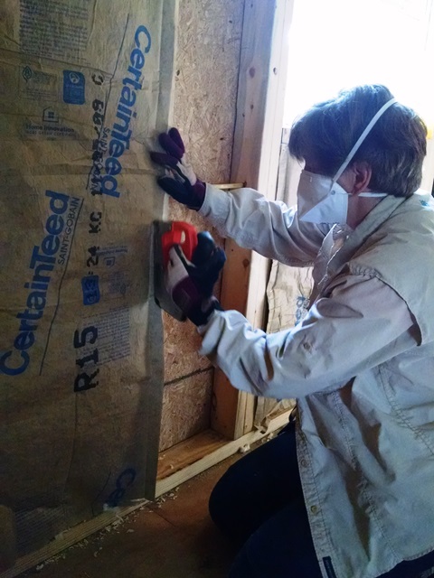 After devotion, we loaded up the scaffolding into Charles’ truck along with the drywall lift and headed to the job site. It’s spring break for the Baton Rouge schools this week so traffic was fairly light. Everyone quickly got to work with Stel and Barrie working on framing the walls, and Ron and Jodi on demo of the sheathing on bedroom 2. By the end of the day all the exterior walls were up, the rafter hangers were in place, the sheathing down, and the door was cut from the living room to bedroom 2. Suzanne, Lee Ann and Mary worked on the siding. Jodi joined them later in the day. There is now siding on three sides of the first addition and one window is trimmed out. One more piece of siding and we will be ready to put the scaffolding up for the higher areas. Max and Anne worked on bedroom 1 addition, using foam insulation to complete the installation of the roof and then installing the ceiling and wall insulation. It is almost complete and should be completed tomorrow. Hopefully some drywall will go up Wednesday or Thursday. A couple of points of celebration today. The green screws for the metal roofing finally arrived today! We may install those in the morning before the roof gets too hot. Also, the conference bought us a tool specifically designed to cut the cement board siding. We used Gary and Avis’ tool last week but sadly they left us this weekend and for some reason took their tool with them. We asked Charles about purchasing one and he found us one today. Yea!! This tool makes cutting the concrete board so much easier and safer because there is no dust. Thanks Charles!