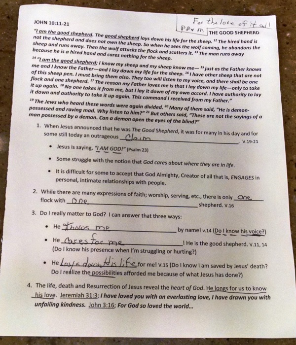And worship we did. We had a wonderful service and Sunday school class today. Hmm – something about entering worship ready to worship? Barry’s message was from John 10:11-21, a familiar passage in which Jesus says “I am the good shepherd.” Great message that we need to be sharing with the world. Think we may listen to it again on You Tube. We enjoy having that option available to us, especially when we are out of town and miss our home church service. They usually stream both the 8:30 service which we attend and the 11:00 traditional service but looks like they only have the 11:00 service up this week. (click here to view) Oh well, its the same message.