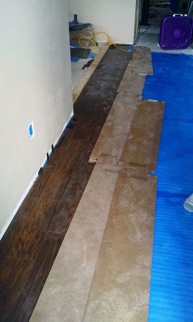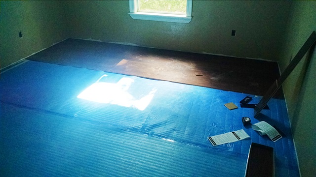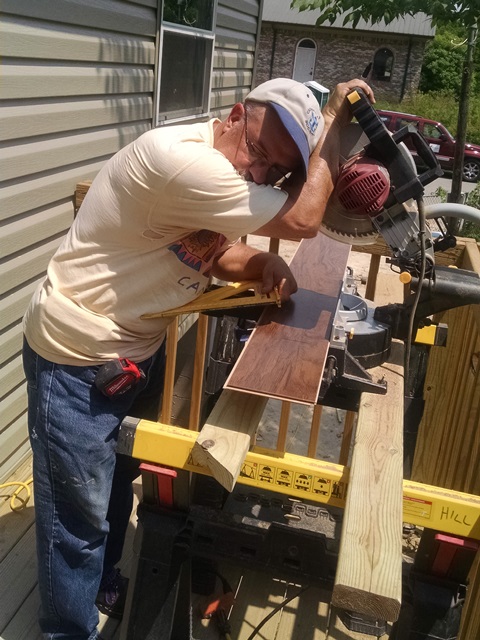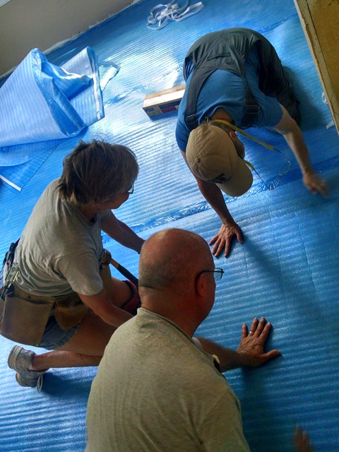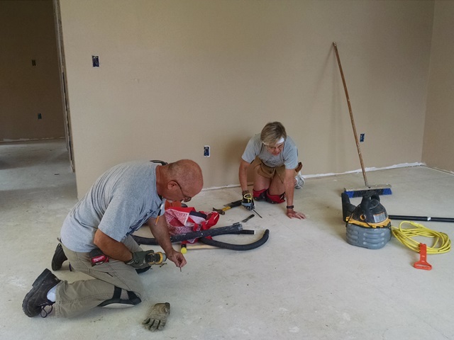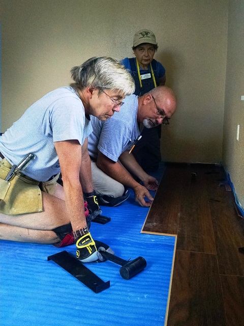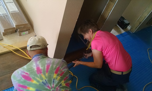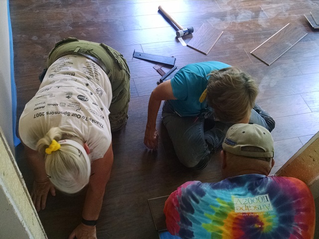 Nula and Phil worked on the closet in the second bedroom and ran in to a few complications but completed bedroom #2 shortly after lunch. Dave, Carol and Anne worked on the living room and hall. There were several complications there as well. Keeping everything straight and square as we worked down the hall with so many doors, i.e. open space was a challenge. There were also some problems at the front door. Last night’s rains left a wet spot under the door so time was spent working on that leak. Nula and Phil joined us in the living room this afternoon. We ended the day with the hall basically complete and the living room about ½ complete. We also still have to install laminate in 3 hall closets and part of the laundry room. Hopefully Monday, after some rest, we will be able to make more progress.