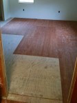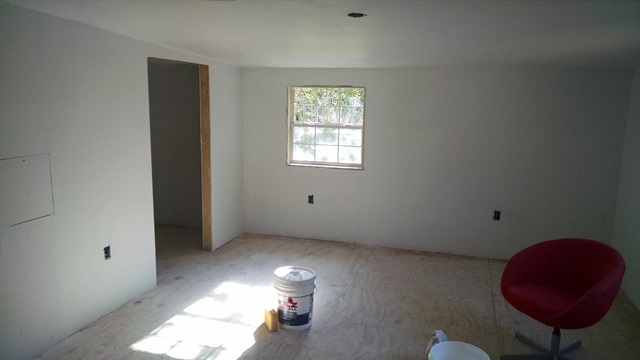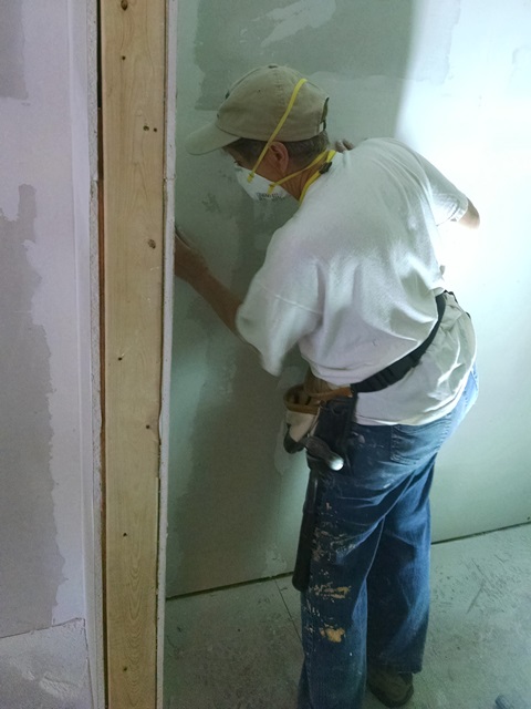 Today we all worked really hard. Stel and Lisa began the day in the master bedroom area, painting the ceiling. Later Lisa painted the master bath and Stel did some drywall work. Carol, Anne, Max, and Mark worked in the second bedroom, bath and closet most of the day. There was a lot of sanding to do. There was drywall dust in the ears, drywall dust in the nose, drywall dust in the hair, drywall dust everywhere! Yes, we wore masks. Max and Dave began installing some underlayment in the master bedroom late this afternoon. Max and Dave also worked on determining what trim we need.