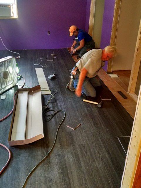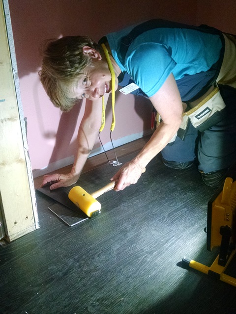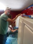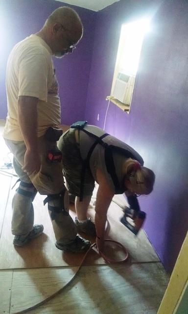 Today at Richard’s was about like yesterday. We were all very busy and didn’t take many pictures. Max, Anne, Stel and Lisa on laminate flooring. Max and Anne also repaired the rotten subfloor in the bathroom. Carol, Mark, Susan and Paul painted bedroom 2 and the kitchen and trim. Most of the painting is now complete. Of course there is still touch up to be done and some areas may need another coat. Dave, Carol and Mark installed the underlayment in bedroom two and the closet and bath so Stel and Lisa could start the laminate on that side. Mark and Dave also worked on electrical.