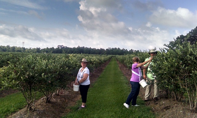 It is blueberry season here in southern Mississippi and this morning we went with Dave and Carol to a local U-pick blueberry farm. It’s only about 5 minutes from the church. It’s a pretty big operation. They have blueberry bushes as far as you can see. Really good berries! We picked about a gallon and have been munching on them all afternoon. We have three nice blueberry bushes at home but aren’t scheduled to be home when they should be ready so we will enjoy these. If we get to pick those at home we will get to make jelly. We like to keep some good blueberry jelly to give as gifts.