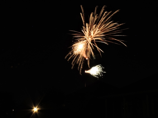 Then tonight there were fireworks all around us. Through the trees we could barely see the big show down by the river, but several neighbors provided closer shows.