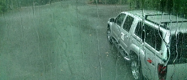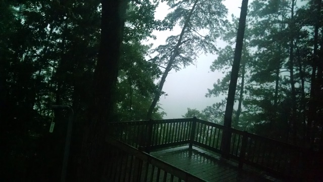 No barges again today. But we did get the storms. It sounded like lightning struck somewhere close by this afternoon. The campground lost power for a few minutes twice after close strikes. You couldn’t see across the river or the dam it was raining so hard. On the plus side, the temperature dropped to 72 for a short while. Incredibly cool for August in Alabama. It’s actually quite nice out this evening and we are sitting out on our deck looking over the river working on this blog entry. Hopefully our ThermaCell will keep the mosquitoes at bay.