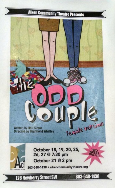 After dinner we drove on over to Aiken, SC to see a production of “The Odd Couple, Female Version” at the Aiken Community Theatre. It was opening night of Neil Simon’s revision of his hugely successful play. The lead characters were transformed from Felix Unger and Oscar Madison, into Olive Madison and Florence Unger. The play was funny and well done. We had a great day with our family.