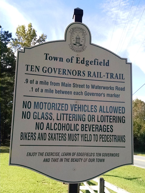 Interesting that there have been 10 South Carolina governors that were from Edgefield. The trail winds around Slade Lake, over quiet streets and neighborhoods, a soccer field and an old railroad trestle. There’s also a fishing dock and lighting for evening walks. There is a new extension that gives additional length to the walk and it appears they are working on extending it even more. We had a nice walk.