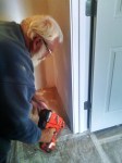 We all went back to work where we left off yesterday. We went over to Sheryl’s house to go over the work order and what had been done this week so we would no where to start Monday and then headed back to Jackie’s house. Today Sharon applied a couple coats of paint to the doors in the back bedroom. She also filled nail holes on trim and painted crown mold. Gary and Max worked on installing doors most of the day and by the end of the day all but one was installed. That last closet door will not be installed until after the water heater is installed in that closet. The doors are taking longer than usual because we are working in a manufactured home and the rough opening are not standard size. So each door and its casing has to be shortened and some of the rough openings have to be widened. Anne worked on some more drywall, filling nail holes and painting Kilz on trim. We all had a good day and are making progress. Larry, Ginger, Bill and Ogie continued work at Sheryl’s house. They completed the bathroom trim, got all the under-layment installed in the kitchen, and re-routed some plumbing. They have done a great job on that house.