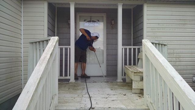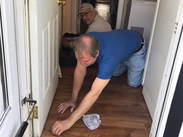 After discussing our goals for the day, we all headed back out to the job sites with everyone returning to where they left off yesterday. At Cheryl’s house Susan, Bill, Reid and Max worked to finish up the details. Max located an outlet on the new kitchen wall and got that operational. That meant there was a little work to be done to the drywall as well. Susan and Bill painted the kitchen ceiling, while Reid reinstalled the fan in the bedroom. Then of course there was cleanup work to be done. Everyone was back over at Jackie’s about lunch time. Max did the walk thru at Cheryl’s with Jeff about 2:00. There were a few little items on the punch list like a little additional painting and trim work. Essentially the job is finished but we will send some folks back on a while on Monday to complete the few items. Otherwise everyone is now working at Jackie’s. Today we finished the closet in one of the bedrooms including shelving. Jackie salvaged the wire shelving when all the drywall was torn out. That same bedroom got a coat of wall paint and the window painting is almost complete. Anne and Carol worked in that room most of the day and it is looking better. Bill installed the closet shelving just before we quit for the day. Looking good! Mike and Dave put together a new pressure washer and then resumed their baseboard installation. They have it all down except for a few areas where other work has to be done first. Reid used the new pressure washer to clean the front and back porch in preparation for painting next week. He also pressure washed the siding as needed. Susan, the caulking queen, started caulking the windows and baseboards. It looks so great! We will of course have touch up work to do on the walls as we get closer to complete.