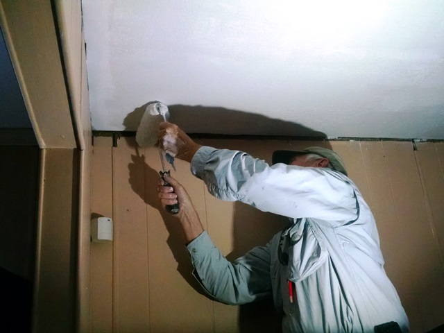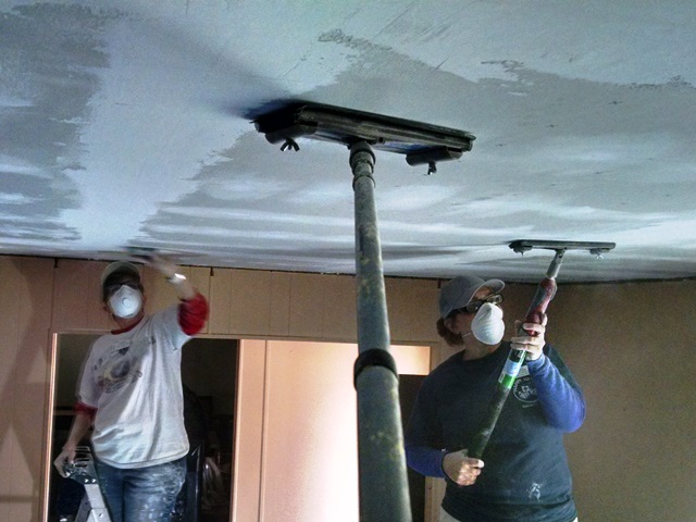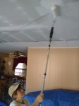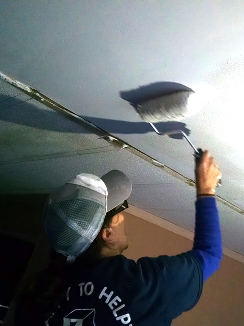 We all headed back to work at the same places we left off yesterday. Lee, Anne and Max were back at Bruce and Elsie’s house. We moved the TV out again and covered the floor with our tarp and then started sanding the ceiling. Some of us will probably be sore tomorrow from all the over the head sanding but in the end we were pleased with the outcome. If we were not going to texture the ceiling, we would want to do another layer of mud but with texture we will be fine with just the two. We were able to get a coat of Kilz on the drywall before we stopped for a late lunch. By the time lunch was over we were able to start applying the texture. We used a 3/4” fluffy roller to apply the drywall mud for texture and it worked fairly well. We worked late tonight in order to complete the texturing. Once we were started we didn’t want to stop until it was done. Hopefully we will be pleased with the results we see tomorrow after everything is dry. The living room is rather dark with no overhead lighting so we want to see what it looks like by the light of day. Elsie was happy with just the unfinished drywall so we hope she will be even happier once we get the textured ceiling painted.