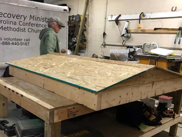 Since we completed Elsie and Bruce’s house yesterday, job assignments changed today. Anne and Gene went to Jim and Mary’s, Max and Cindy stayed at the warehouse to build a pump house cover for Jim and Mary, while Mary Ann, Dave, Bruce and Lee went to Jackie’s. Philip was under the weather and not working and Carol had to go back and see the therapist and orthopedic doctor.