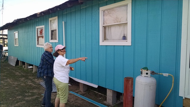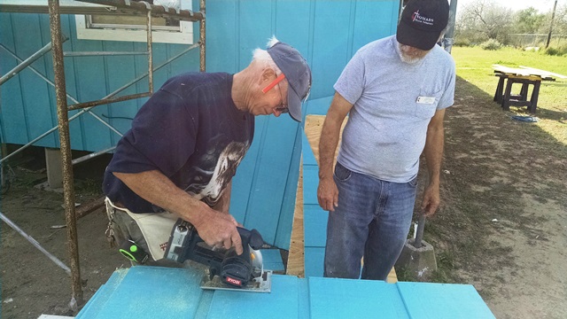 We then all went back to work. Rita and Anne began working on the flooring in the bathrooms at the church that Stel had started. Max, Diane and John went back to Gilberto’s to do the caulking and install the remained of the trim. Dave and Roger went back to Josefina’s and Max joined them after completing his work at Gilberto’s. Gilberto’s house is now completed and we know they are be glad to have their home back. Several of us went back to Gilberto’s to do the outside cleanup after lunch but the wind was blowing so hard we decided to wait and return tomorrow. Things kept blowing off before we could get them secured. Back at the church Rita and Anne completed the flooring in the bathrooms and then John installed the toilets. Max help Rita and Anne and then worked on the shoe mold. There is still a lavatory and more shoe mold to complete tomorrow. We didn’t go back out to Josefina’s this afternoon and don’t know exactly what is left to complete there. Roger and Joel were working on the back porch when Max and Dave left for lunch. Things are really coming together and we should be able to complete all the church has asked us to do. A week ago we weren’t so sure about completing it all but it’s looking a lot better now. Two more days. Then we will be on the road again.