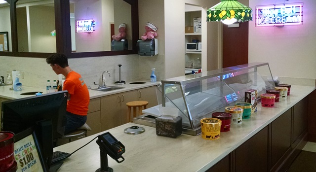 Today we did a nice morning walk and then went to Brenham, TX, a quaint little town about 37 miles from the park. We met Linda and Dave there for lunch. We planned to eat at a restaurant they like called “Must Be Heaven.” Just our luck, they were closed today. We tried a restaurant around the corner named “Funky Art Cafe”. We all had different kinds of salads – they had many, and everyone enjoyed their choice. We visited for a while at the cafe and then decided to go visit the Blue Bell Creamery. Dave and Linda have been to Brenham many times but never been to the creamery so we all had a good time learning how they make one of our favorite ice creams. Today they were making Rocky Road. Unfortunately, they do not allow photos from the observation deck. It was really interesting to see. After visiting the observation deck and having all our questions answered by a very nice docent, we went to the tasting room. We could taste anything and then purchase a large cup of ice cream for $1.00. If you ever happen to be in Brenham, it’s a real bargain. You don’t even have to go to the observation deck. You can just walk in and buy the ice cream. There were not many people there today so after getting our ice cream we were able to just sit and visit in the tasting area for a long while.