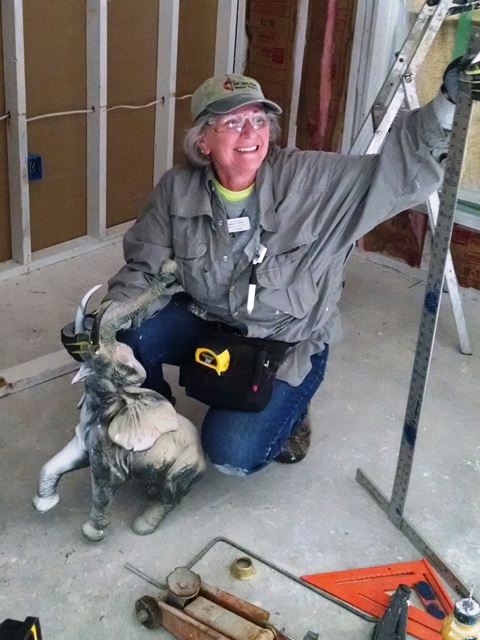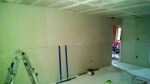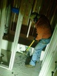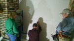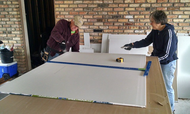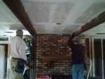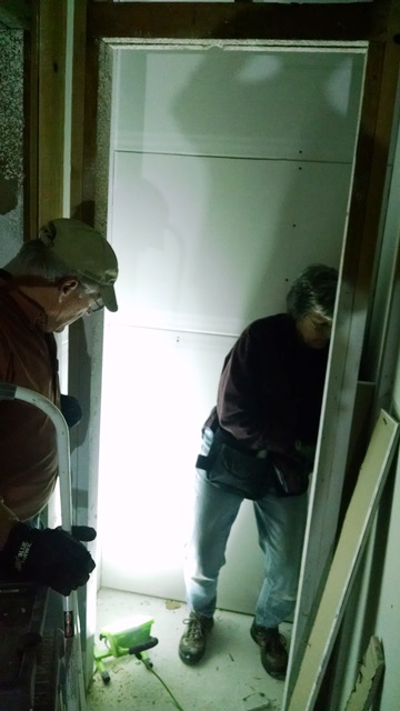Larry and Jean worked with Charles again today. They were here last week working as a drop in and Darryl wanted them to finish up the insulation and underpinning they started then, since we probably won’t have weather for outside work the rest of the week. They completed that task mid-afternoon and joined Max’s team hanging drywall. Harry started the day breaking up the old, heavy (300 lb) castiron bath tub and the rest of the guys helped get it out of the house. The team then worked on taking down the decorative beams in the living room. After those two items were marked off the list everyone began hanging drywall. They made great progress today but there are still a lot of sheets to be installed.