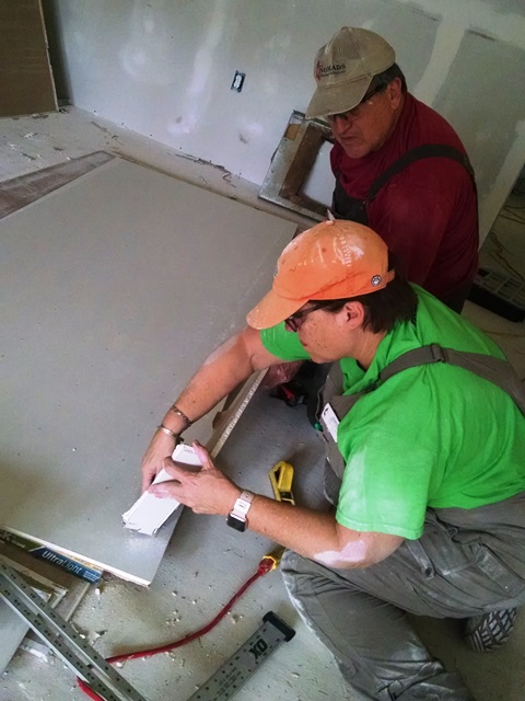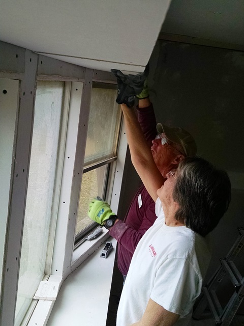 Out at Norwich the drywall finishing continued. Rita worked on some taping and mudding of vertical seams while Nancy sanded and then applied a second coat of drywall compound (mud) in one of the bedrooms. It’s looking good. When the house at Norwich was mucked out after the flood, the removal of the drywall from the walls was not done very carefully resulting in significant damage to the ceilings. Jean has been working on the mudding/repairing the damaged areas. Rita also worked on patching some of the larger damaged areas. Gary was back at installing corner bead and Dave began learning how to apply mud while they were waiting for the new tub surround to arrive. Once they got the surround they returned to work on completing the bathroom so the drywall could be installed there. Larry and Anne spent the day taping and mudding the horizontal seams where the ceiling and walls meet. They completed the large family room and the kitchen and dining room today. Again, making good progress but there is still so much to do.