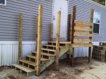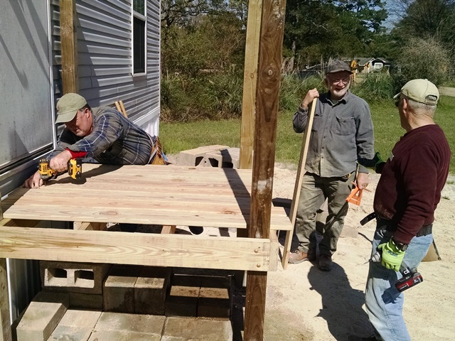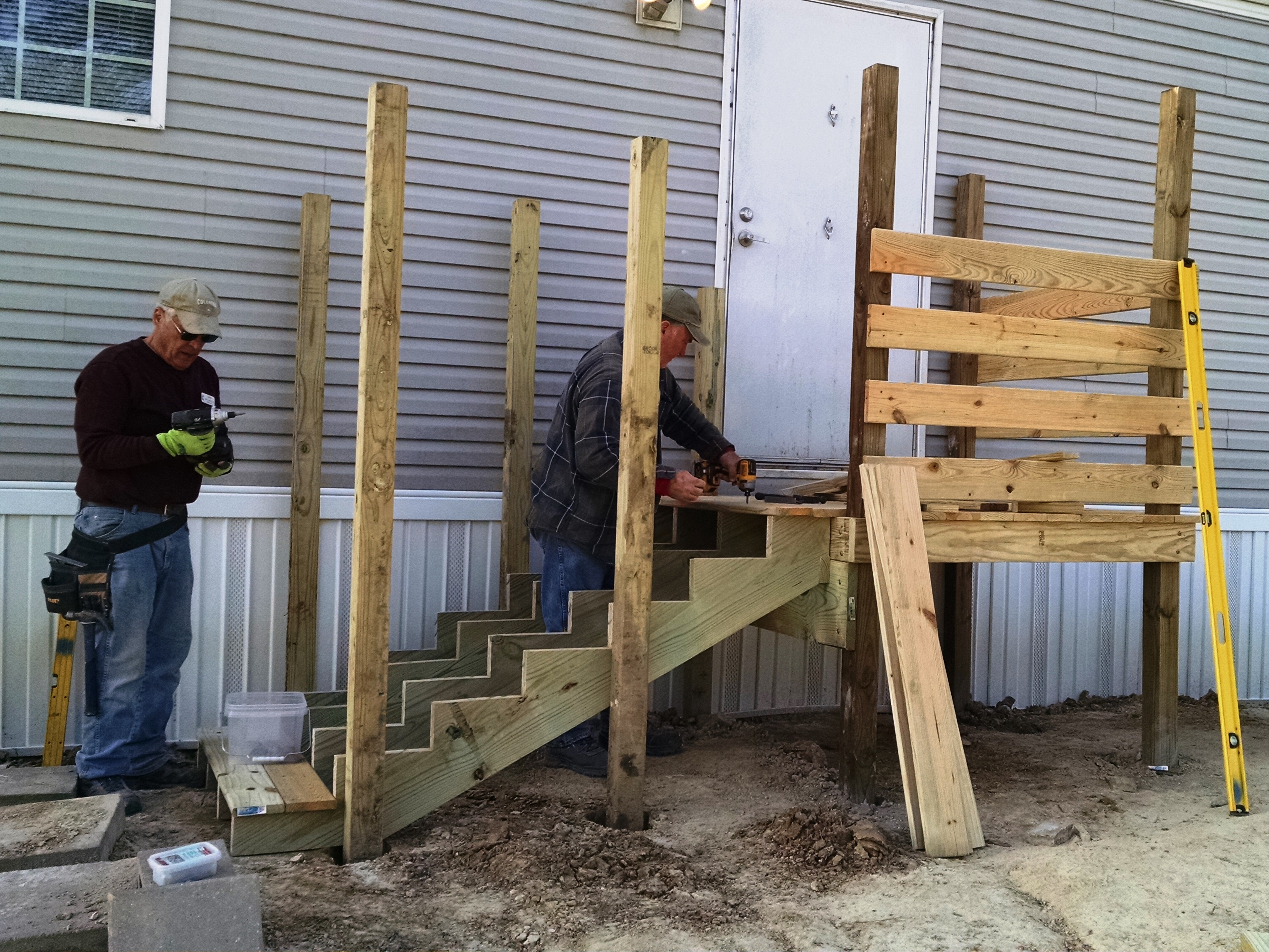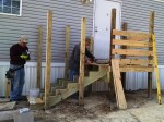 Gary and Harry (and later joined by Larry) returned to Old River Road to finish the porches. They finished the back porch, leaving the railing off one side for the ramp. The front porch was constructed and decked and the steps completed. All it needs are the hand rails for the steps.