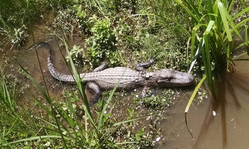 We slept in a little this morning and then readied our bikes for a ride. But before we left we we had to say “see you down the road” to Suzanne. Such a good friend. We will miss her. But, she plans to be at annual meeting in September so we should see her then. We then headed to Mandeville, LA , about 65 miles east of Baton Rouge on I-12, to one of the trail heads of the Tammany Trace Bike Trail. Tammany Trace is a great 31 mile asphalt rail trail. It begins in Covington and ends in Slidell, LA. We rode about 7 miles from Mandeville eastward toward Slidell, for a total of 15 miles including a couple of side trips. The trail goes through wooded areas and bayou areas. We saw beautiful water lilies in bloom, as well as a water moccasin crossing the trail and a small alligator in a ditch. It was Saturday so there was a good group of people using the trail today. It was nice to see the families out riding the trail.