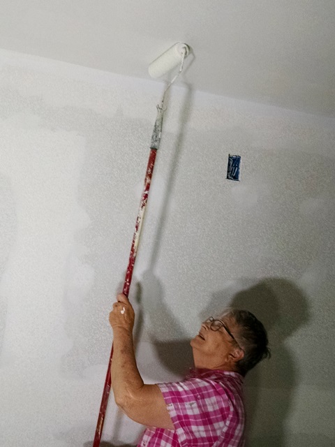 Today Cheri brought the devotion reminding us that ministry is being where God needs us – where we need to be. Then Butch, Cheri and Suzanne joined us at Norwich drive. With the extra help we were able to finish priming and painting the ceilings and start the walls.
