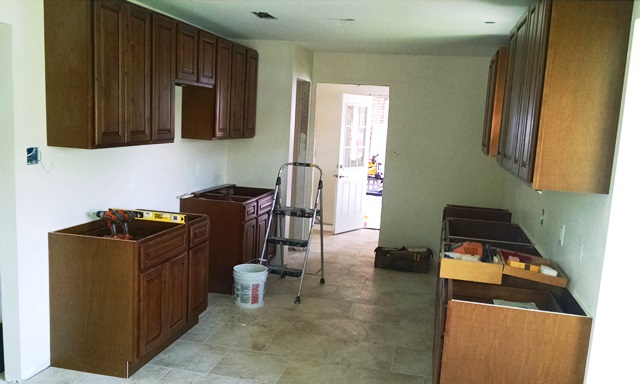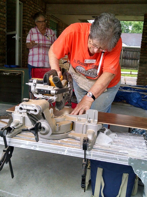 We returned to Norwich Drive with Bob, Virginia, Janice, Marvin, Sharon and Suzanne to continue working on the flooring and cabinets. Today the cabinets were completed and counter tops are to be installed Saturday. The kitchen is beginning to look like a kitchen and after Saturday it should be beautiful. We also made good progress on the flooring, completing one bedroom and closet, the huge master closet, and started in the hall and second bedroom. The plumber/tile man is almost done with the master bath so we will start finishing that drywall next week. The bedroom wall that had to be removed to install the roll-in shower hasn’t been reinstalled yet but hopefully that occurred today. Dave, Ruth Ann and Gary went back to Groom Road to work on cabinet installation and the bathroom there. They also made good progress. The cabinet install there is made considerably more difficult due to the floor not being level but it will look good when we finally get it done. We were told Thursday, the Groom Road house will be our top priority Monday and Tuesday because the home owner must be out of the FEMA mobile housing unit. FEMA is supposed to pick up the trailer Wednesday. Hopefully, with two hard days we can have a working kitchen, bath and the flooring in one bedroom. We will need lots of energy next week.