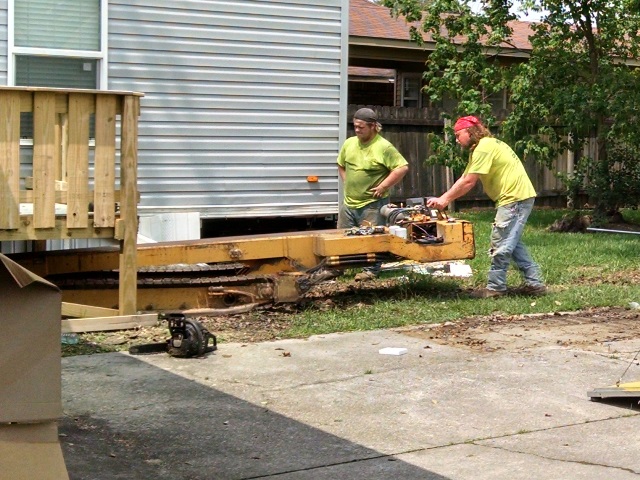 We all headed back to our regular homes to begin our last day of work. The mobile home movers were at Norwich when we arrived, readying the mobile housing unit (FEMA trailer) for moving to the FEMA collection center. Our homeowner had to be out of the trailer by the end of April. She is now staying in a hotel until her house is complete. The power company came by earlier in the week to pull the power meter but since we were there working and needed the power, they say they would come back Friday. The guys doing the work today were really nice and let us keep using power until the FEMA office told them to cut it off shortly after lunch. Then in a few minutes they set up their generator and let us have power from that. About 2:00 the storms really came and when the truck came to get the trailer you could barely see to drive. They decided they were not pulling it today and left. The moving guys could have left then too, but hung around and let us continue to use their generator until we were done for the day. Really nice.