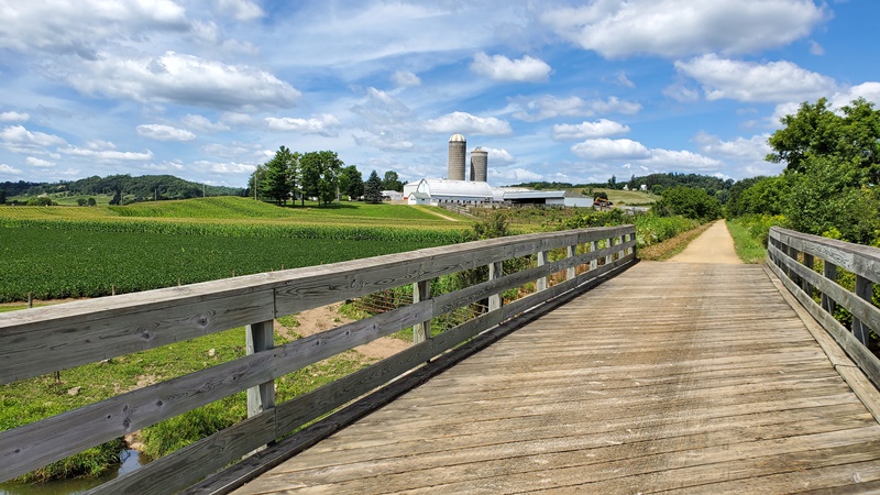 We had a relaxing morning and then left to go ride one of the many bike trails in Wisconsin. We have been surprised at the many miles of trails available. Some of the trails are state supported and there is a permit required to ride the tails. Daily use is $5.00 and annual fee is $25.00. We considered the Omaha Trail but found online that the part we were looking at riding is actually still closed from the flooding last year. We elected to ride the Elroy-Sparta Trail with plans to begin in Wilton and ride toward Sparta a couple of miles and go thru tunnel #2, return to Wilton and ride toward Elroy 6 miles through tunnel #1 and return to Wilton. What we didn’t know is that the first 3.5 miles from Wilton north toward Elroy is also still closed from the flooding. It’s obvious they have been working on the trail section we rode and just as there are a lot of homes still in need of repairs, so it is with the trails. We road about 7 miles from Wilton past Norwalk, a quaint little village along the trail and back to Wilton, for a total of about 14 miles. It was a ride through some beautiful countryside – lush green fields, dairy barns, farm equipment. In Norwalk, right on the trail is a little Mexican diner with really good soft serve ice cream. We toured around the village for a while because they were setting up for a big truck and tractor pull festival starting tonight. It appears to be a big deal for this little town. On the way back to Wilton, Max had a flat tire. God blessed with a really helpful local couple stopping to help us. Their son worked his way thru college working in a bike shop so they could change a tube in short order. We didn’t get to visit with them for very long because they changed the tube for us so quickly. It was a great ride and a very nice day.