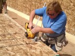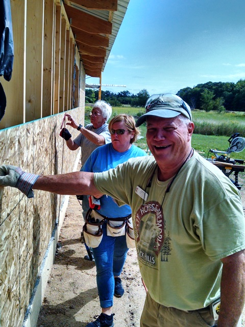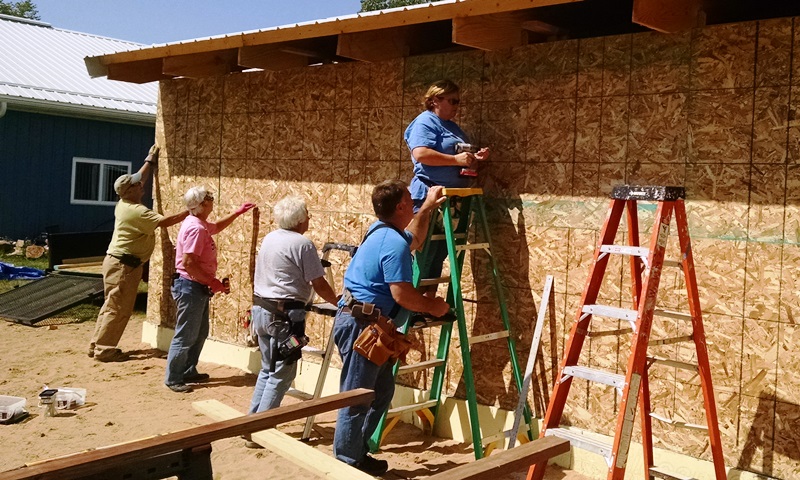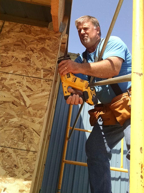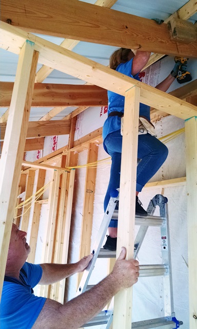 We eventually got back to work with Anne, Betty and Sue heading back out to Liana’s. It took just a couple hours to complete the touch up sanding and priming of the basement. We took Liana’s Bible to her house and left it for her with a note. Tonight we received a sweet text from her thanking us for all we did at her house and wishing us all well. With that was done, the ladies returned to the church to join the rest of the team. Nancy was hard at work completing the sanding of the drywall in the sanctuary. Unfortunately that project didn’t get completed because there was no paint. The Lord must want one of the church members to get the joy of completing the sanctuary painting. The remainder of the day was spent completing the sheathing on the new bathroom addition. We were able to close in two sides of the addition before we ran out of OSB. The Lord must want someone else to have the joy of completing that project, also.