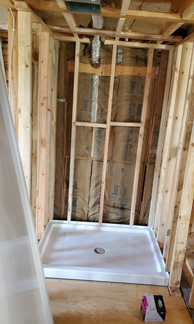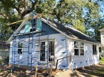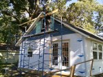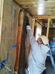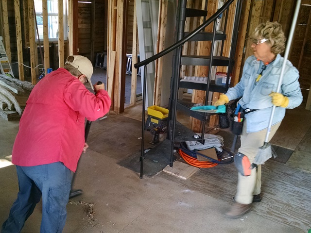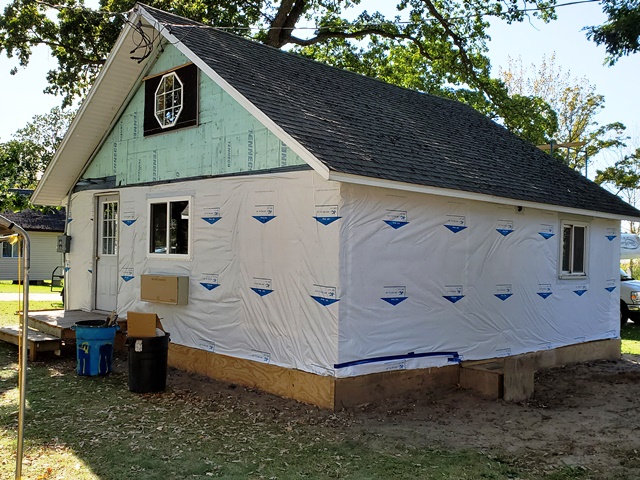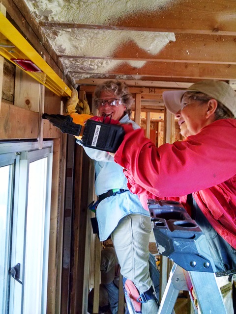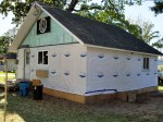After devotional time this morning, we all headed back to our work from yesterday. Jackie and Hilary, heading up our house wrap team, wrapped our cottage up today, except for the high eaves. The scaffold wasn’t delivered until late this afternoon so the eaves will be done next week. Max and Bruce completed the installation of the old front door as the back door. Anne and Jenny worked to ready the bedroom for insulation and drywall. Nailers had to be installed for the ceiling drywall as well as the removal of some of the foam insulation so the drywall can be installed flush to the rafters. Shims had to be applied had to a number of the studs because of the difference in thickness of some of the 100 year old roughsawn 2×4’s. Tom and Mike worked on the shower installation, bath vent installation and PTAC housing (packaged terminal air conditioner) installation. Suzanne worked to keep us in all the supplies we needed and was always available to help with problems. It was the end of a very productive week. We still have a long way to go on the Tibbits cottage but we have made a good start. We are all tried and glad it is NOMADS Friday. We hope to get a little rest and have some fun this weekend.